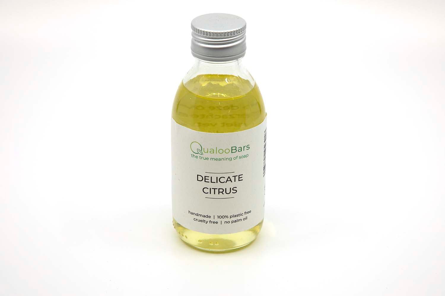Deze QualooBar body oil Delicate Citrus heeft, net als de Citrus zeep, een heerlijke zachte geur van sinaasappelbloesem en gember. Dit maakt het een heerlijk lichtzoete en fruitige geur, de gember zorgt voor een eigenwijze touch. Fris, bloemig met nét dat beetje extra.